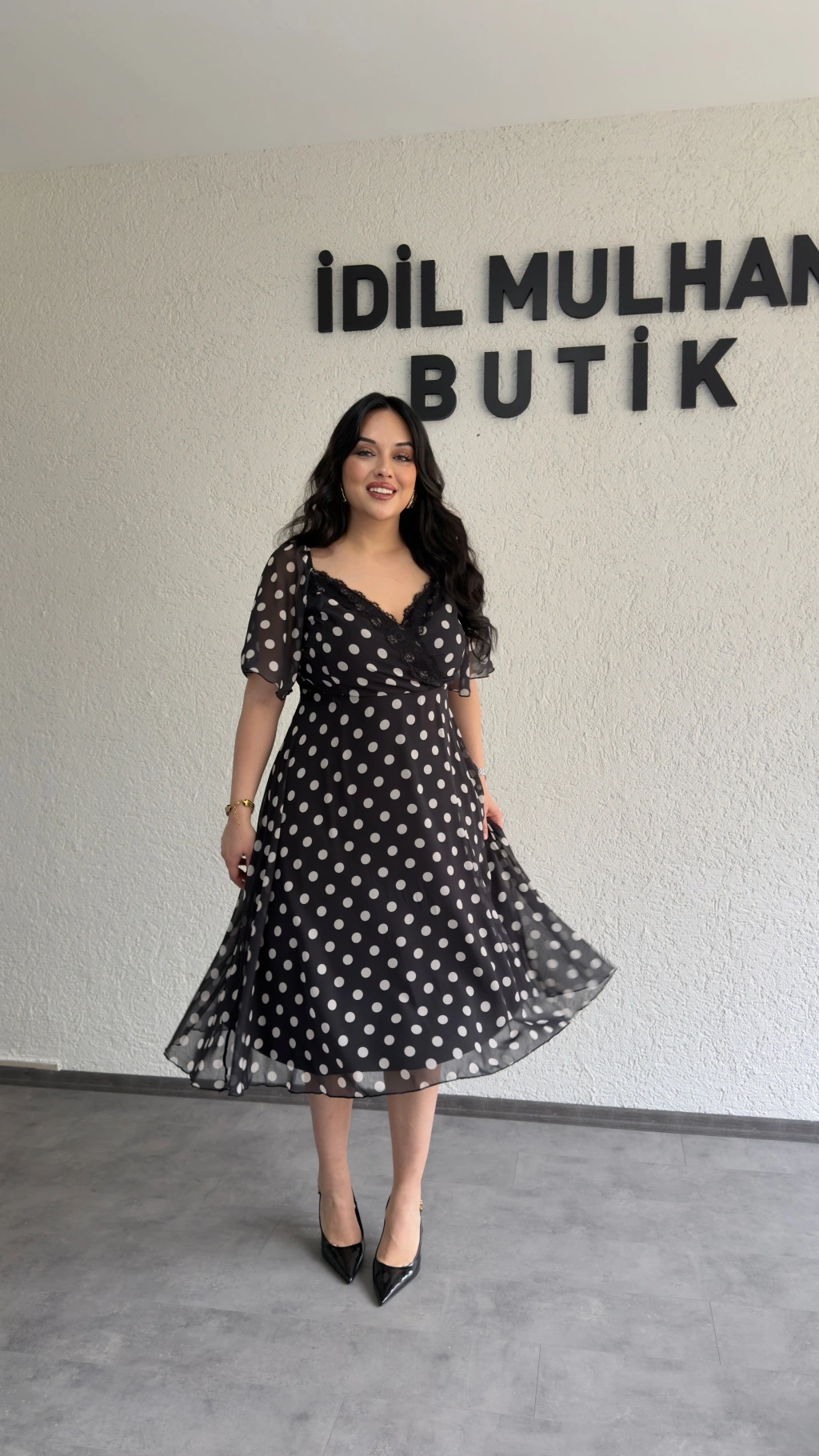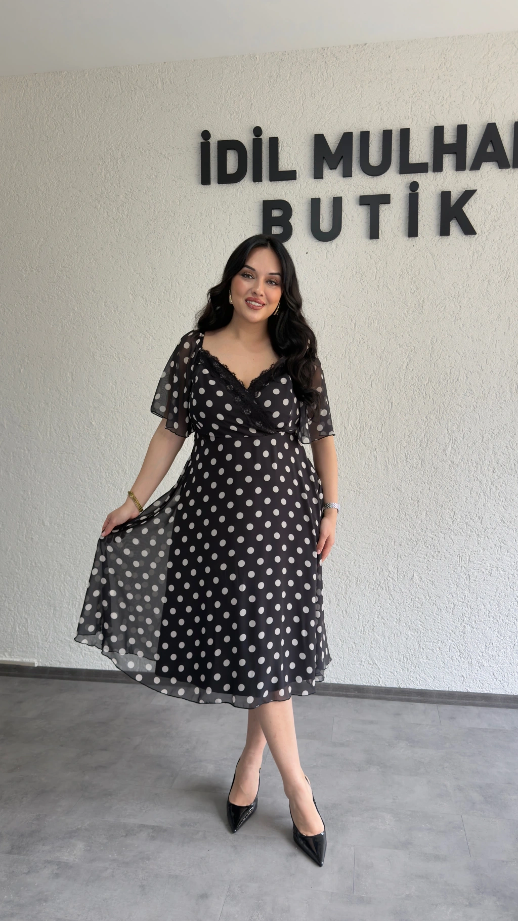 Siyah Kruvaze Dantel Detaylı Puantiyeli Elbise