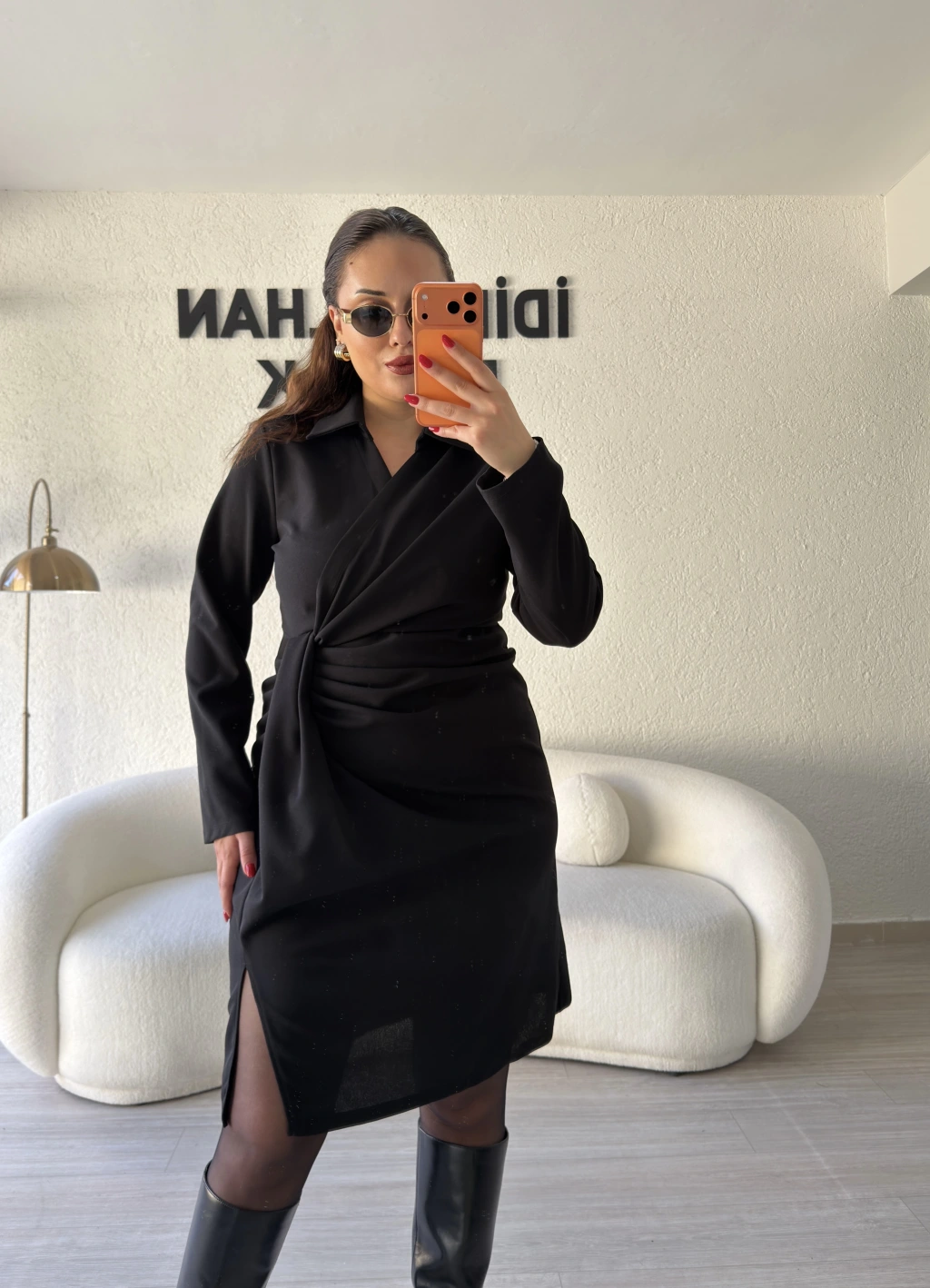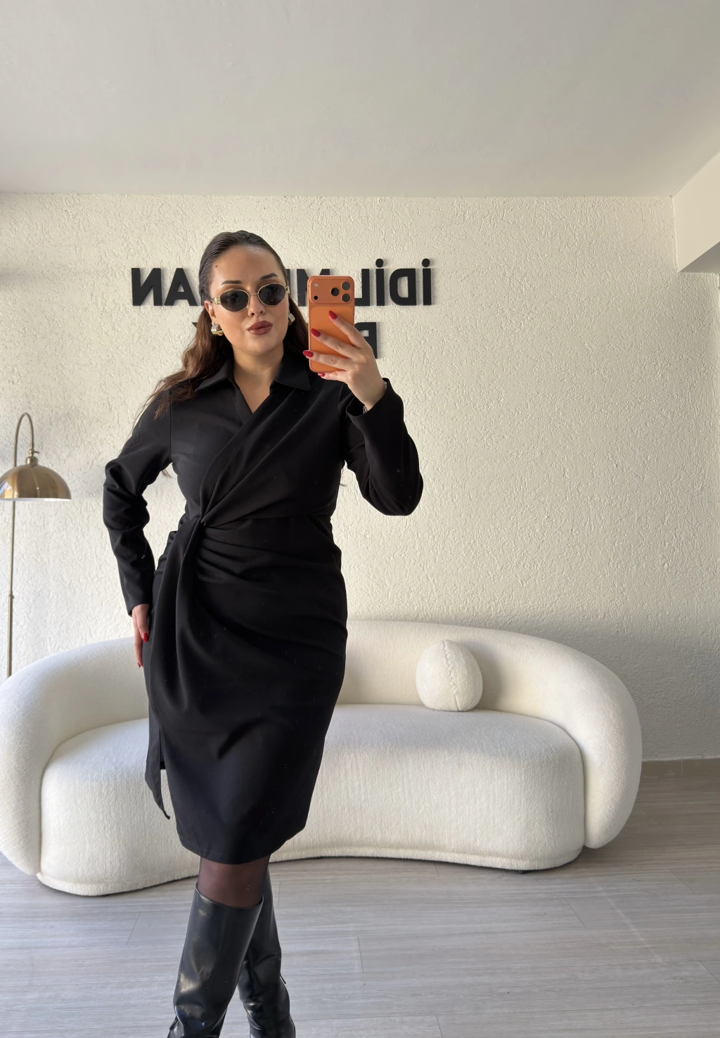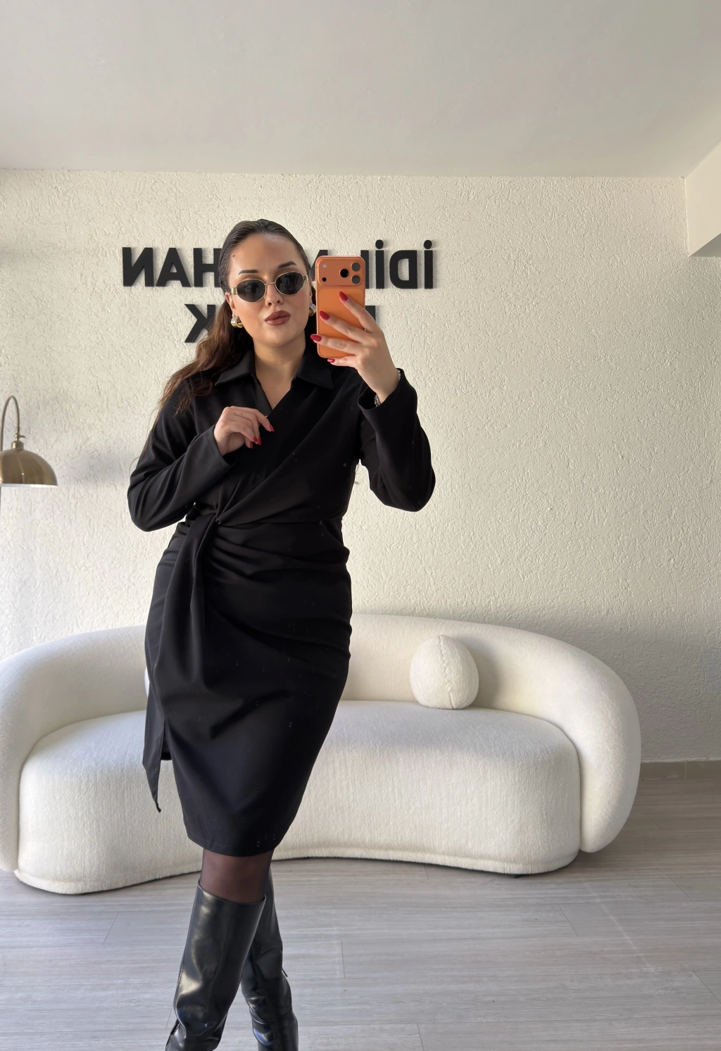 Siyah Krep Kumaş Düğüm Detaylı Elbise