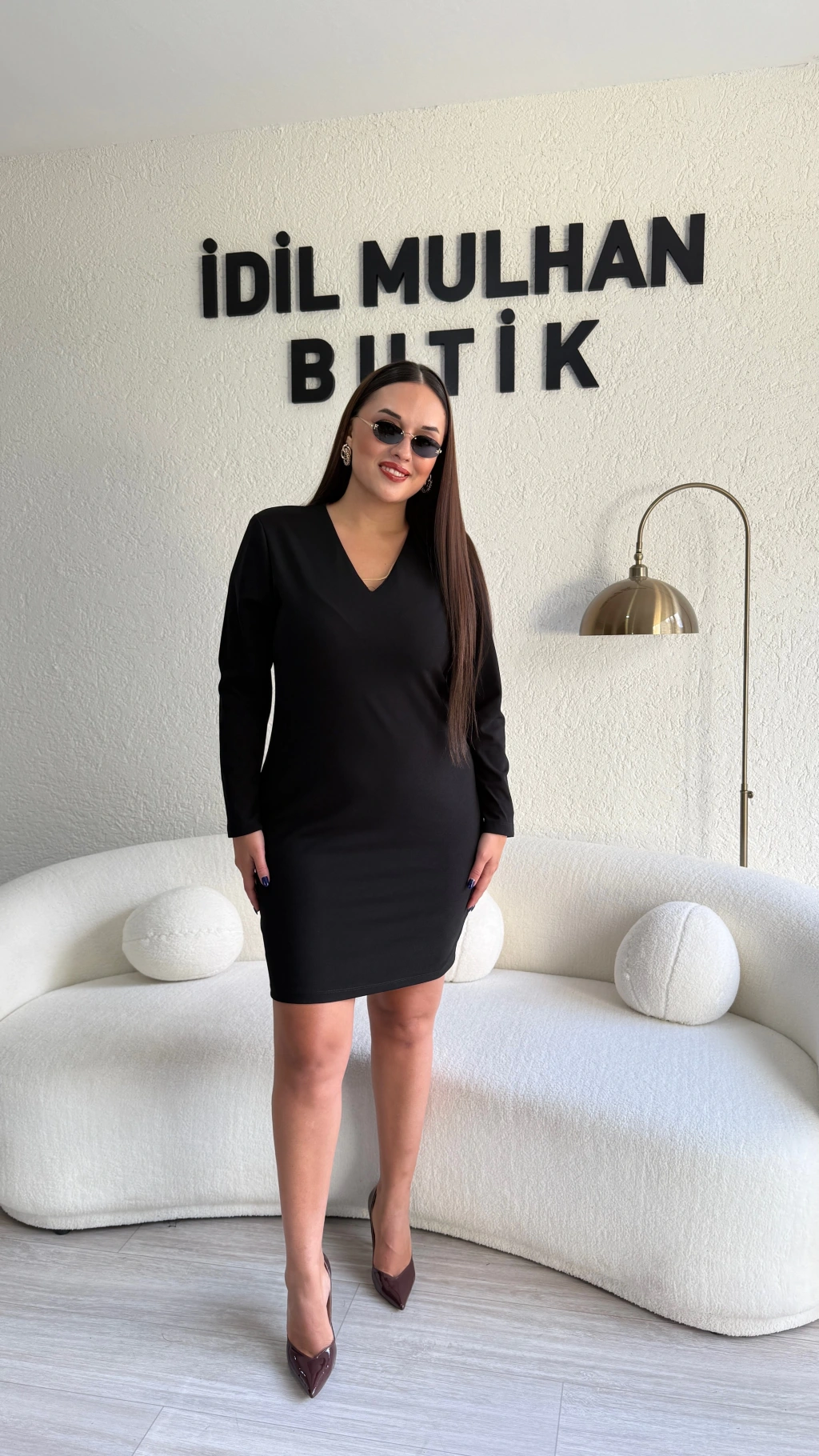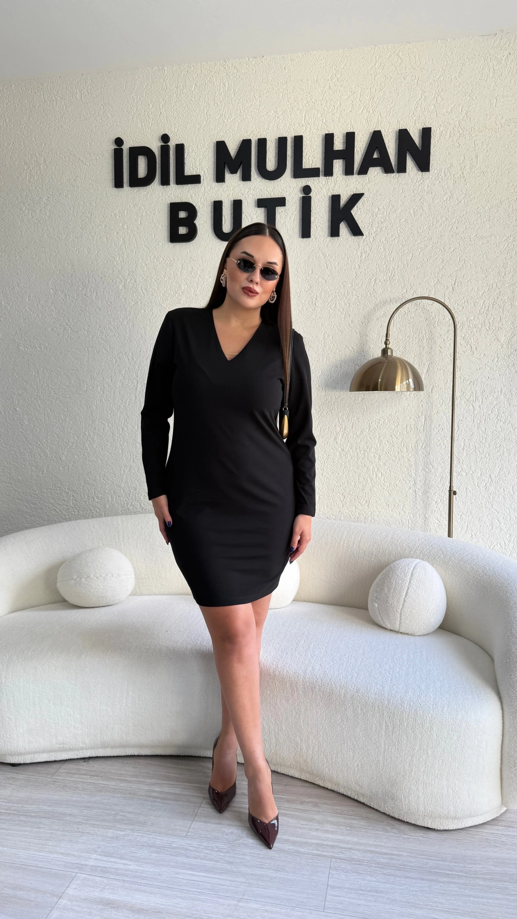 Siyah Omuzları Vatkalı V Yaka Elbise