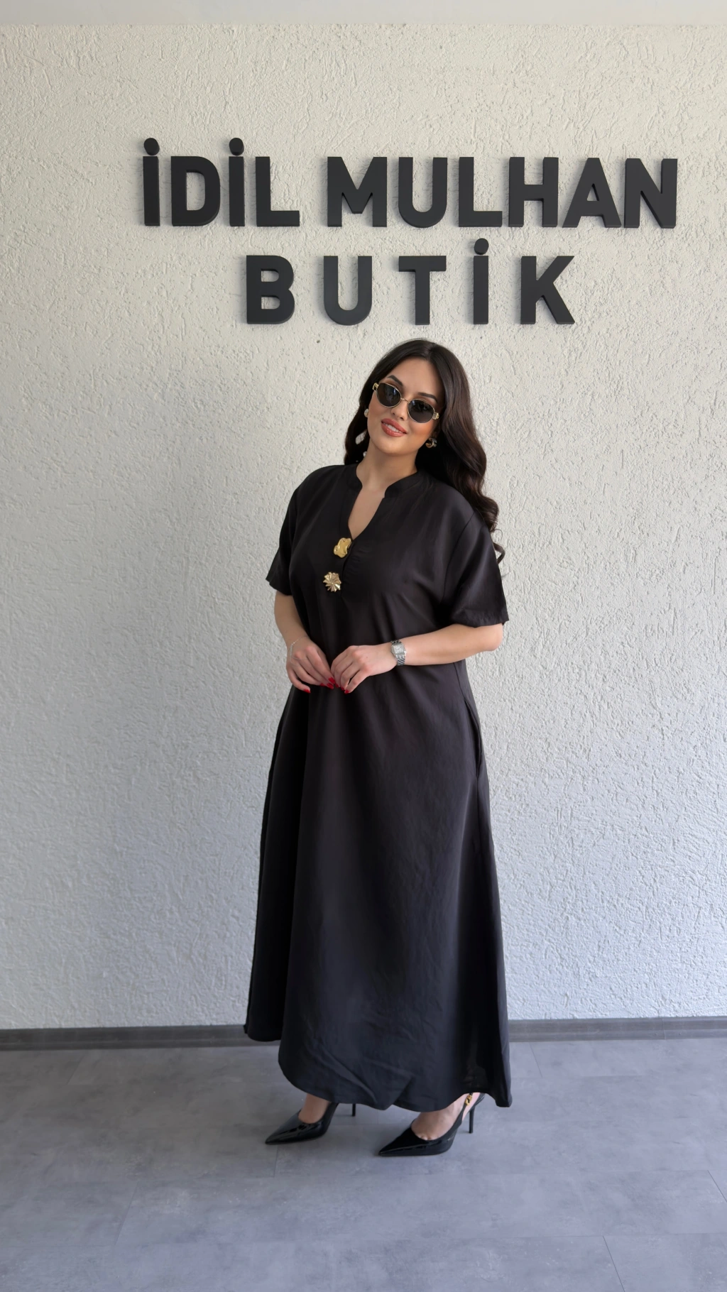 Siyah İşlemeli Düğme Detaylı Salaş Elbise