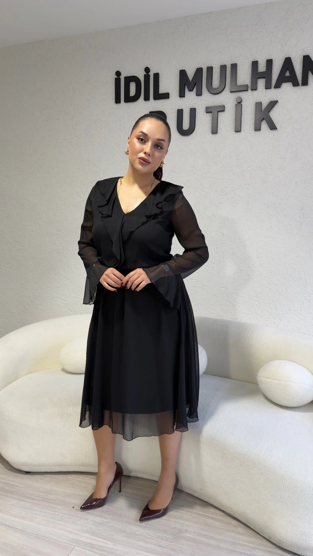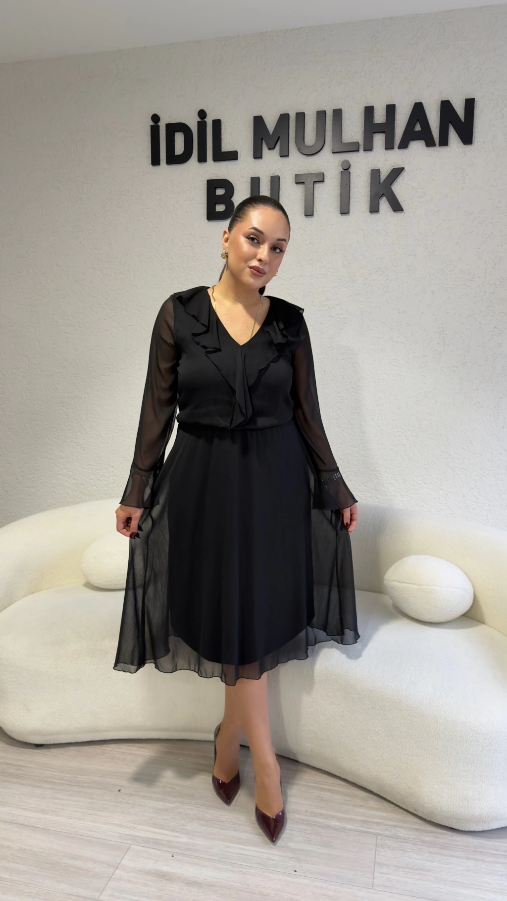 Siyah Şifon Yaka Ve Kol Detaylı Elbise