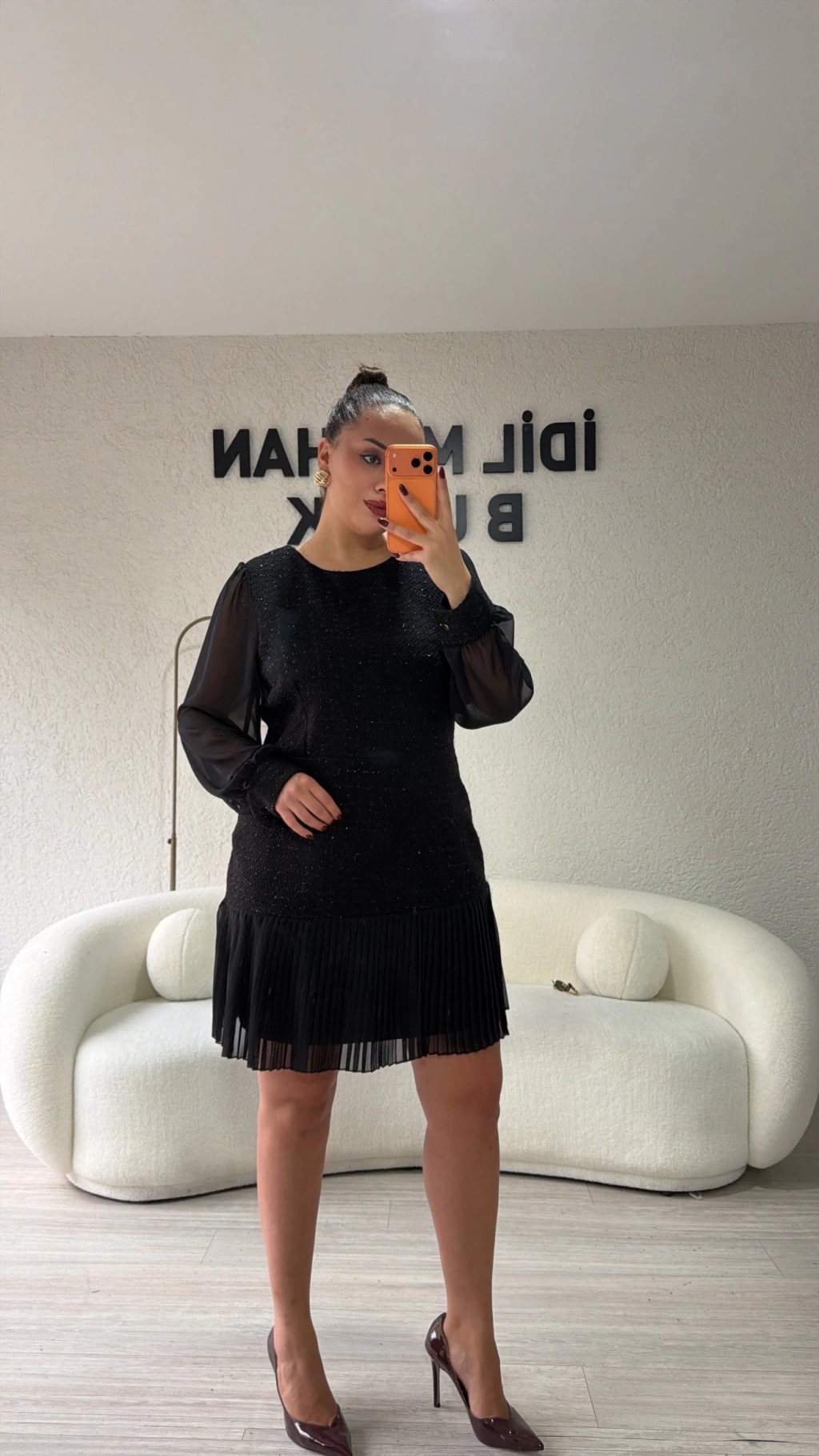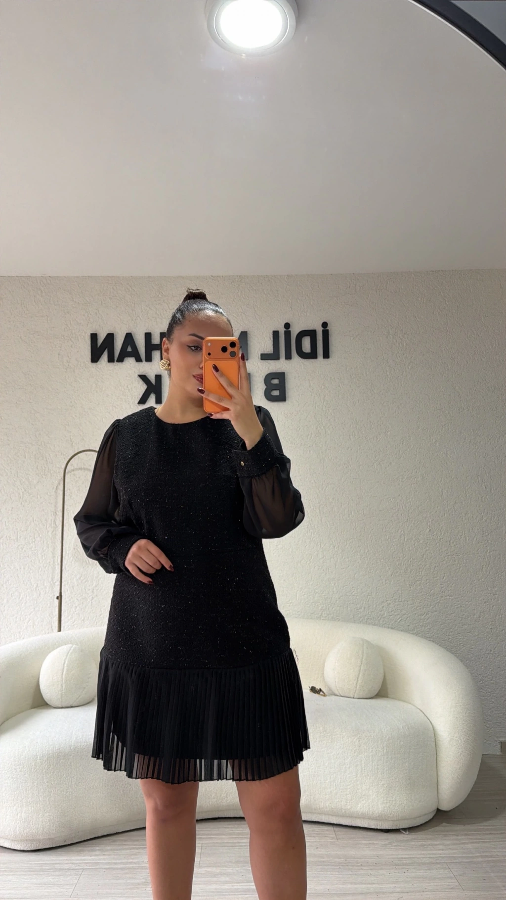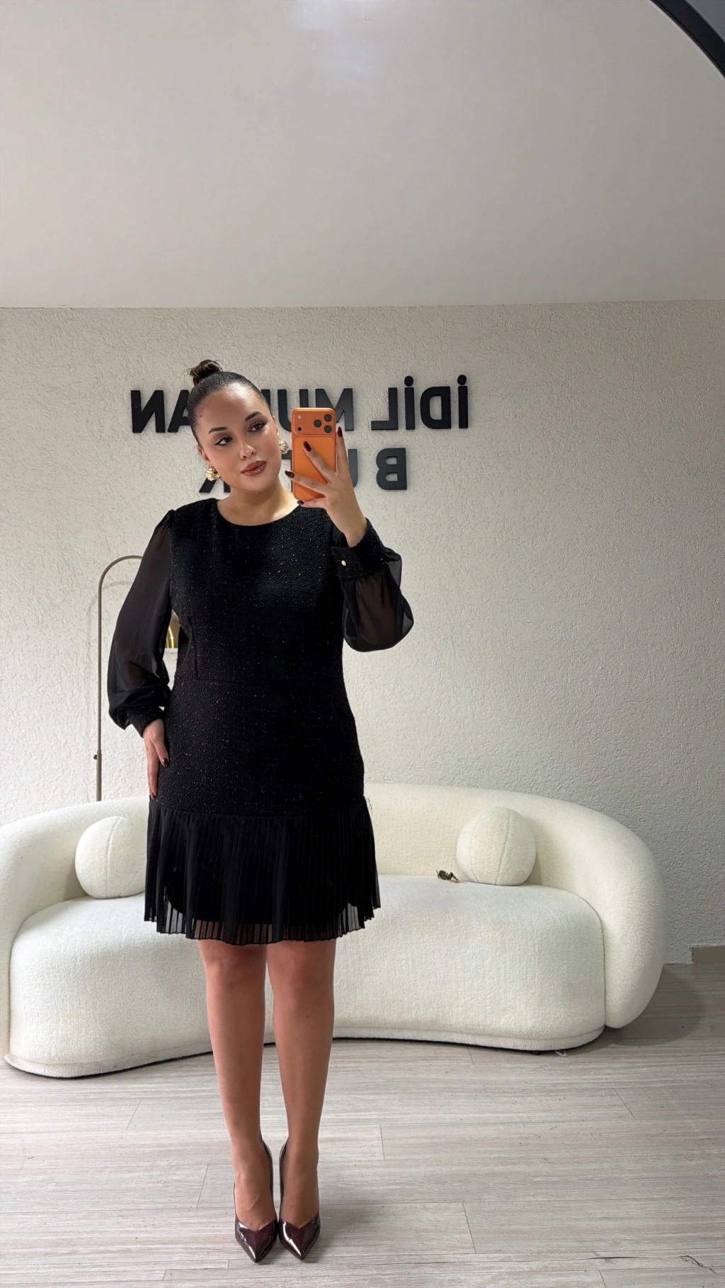 Siyah Kruvaze Yaka Sim Dokulu Kuşaklı Elbise