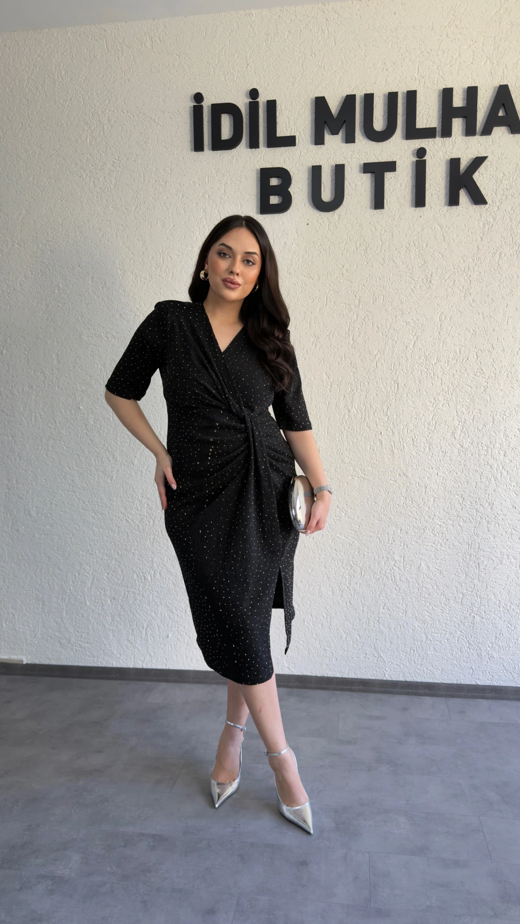 Siyah Sim Işıltılı Drapeli Elbise