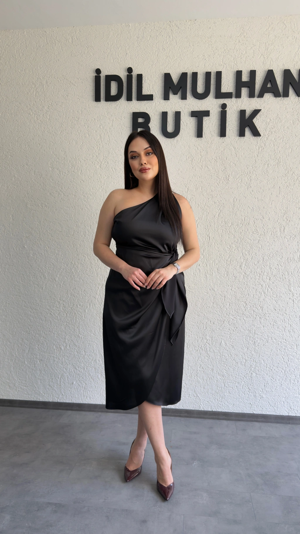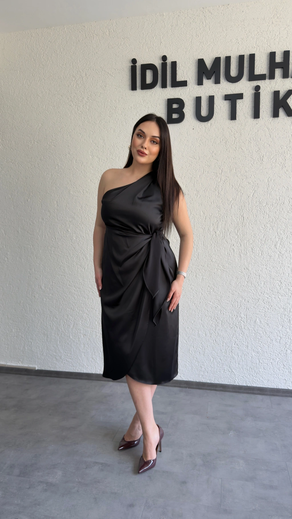 Siyah Tek Omuz Bağlama Detaylı Saten Elbise