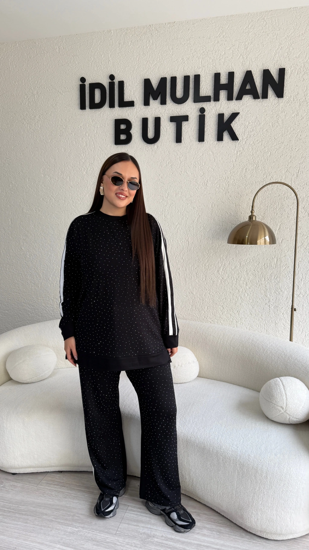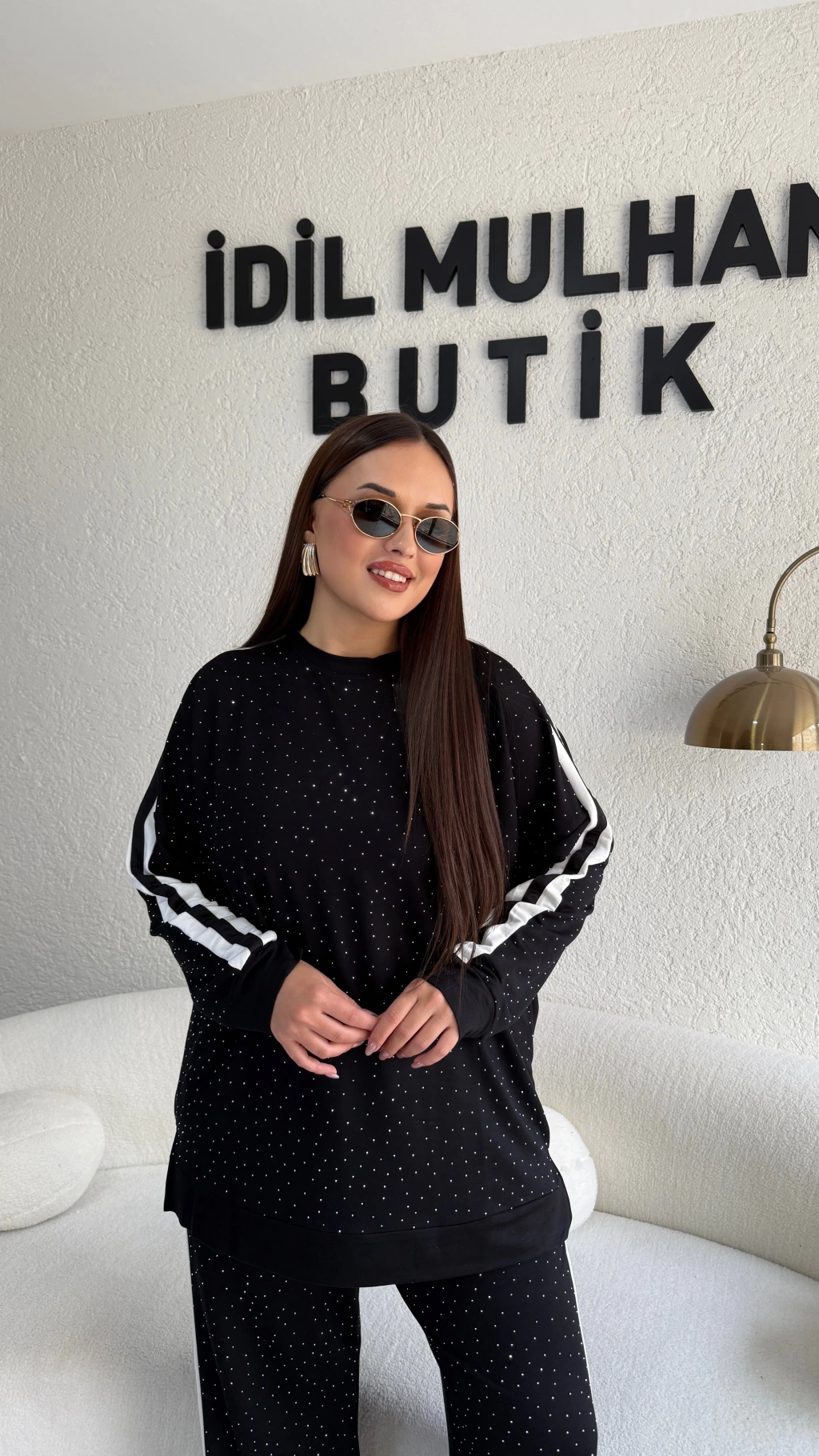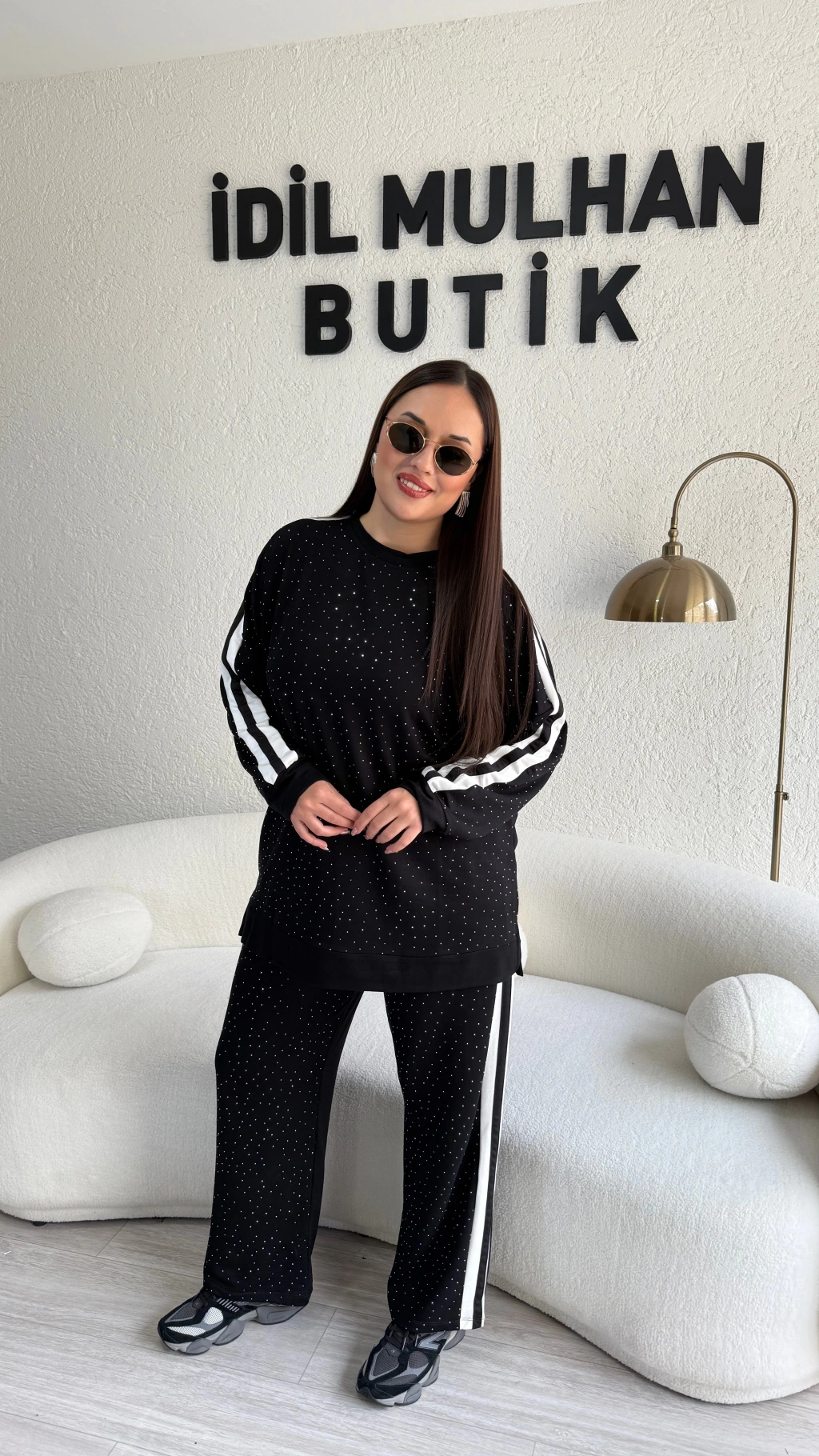 Siyah Yanları Beyaz Şeritli Taş Detaylı Takım