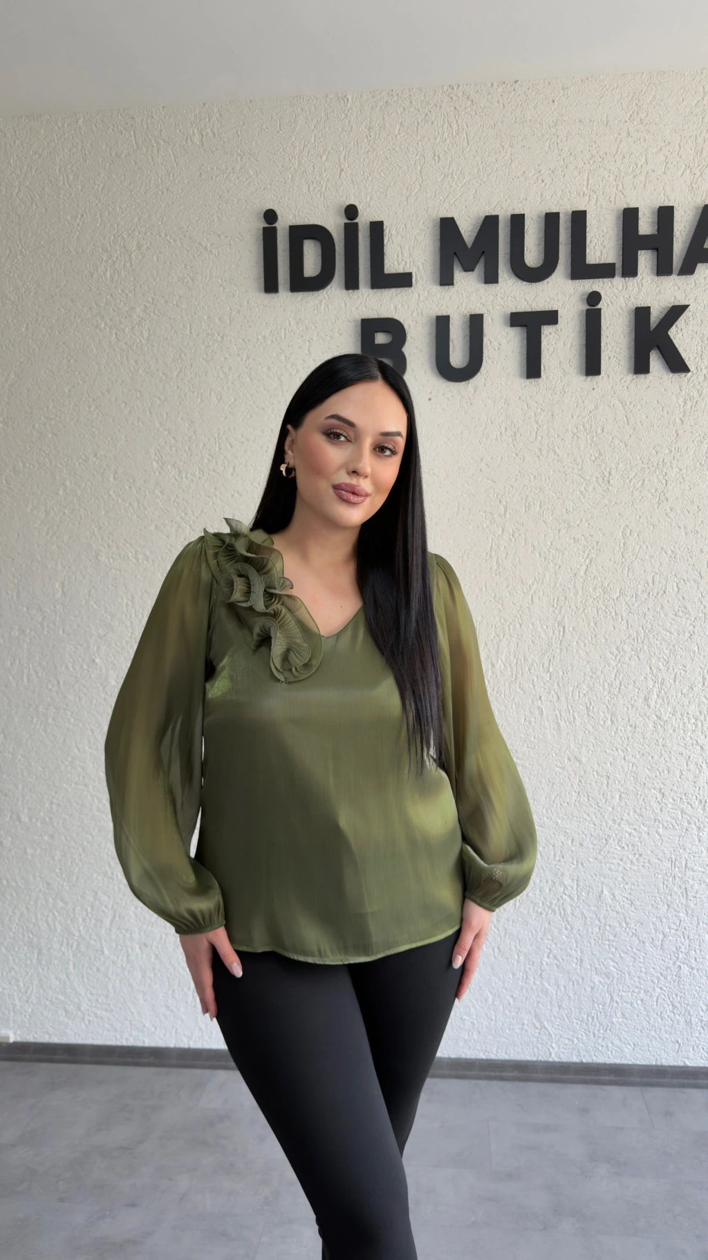 Yağ Yeşili Çiçekli Organze Bluz