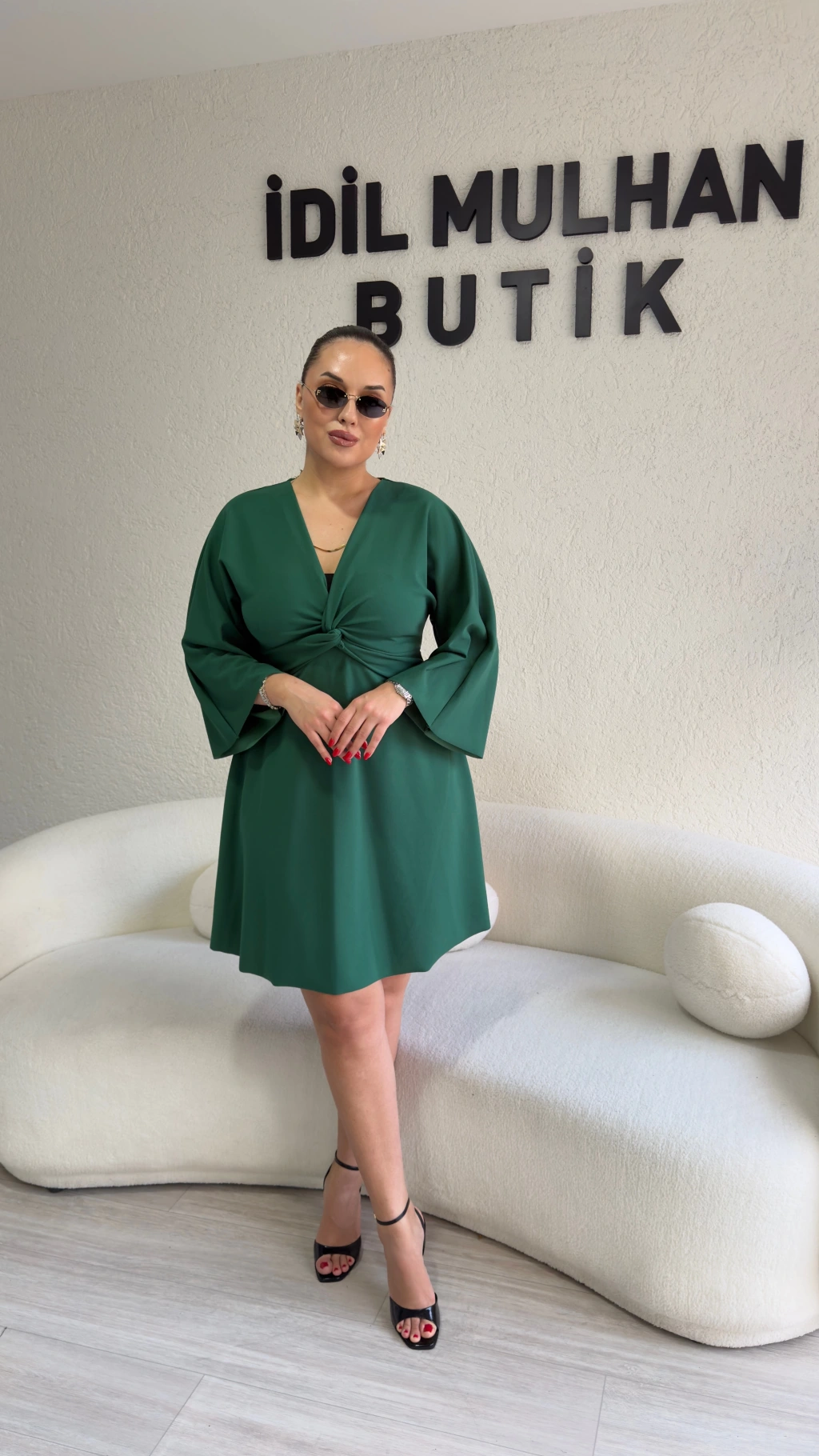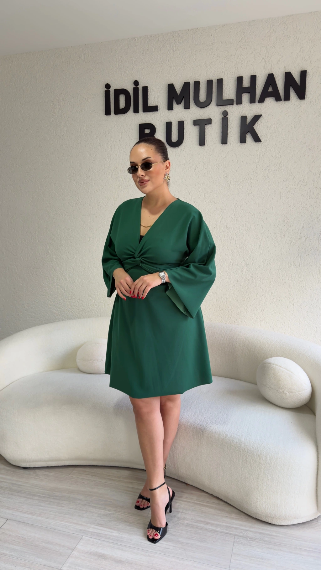 Yeşil Krep Kumaş Düğüm Detaylı Elbise