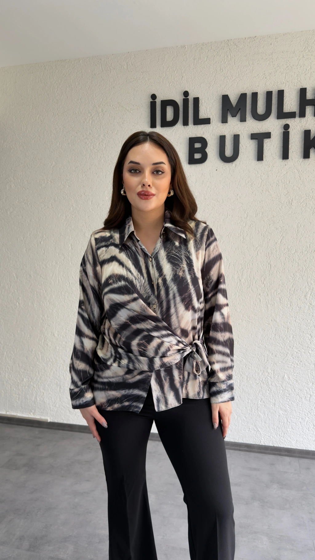 Zebra Desenli Şifon Saten Yan Bağlamalı Gömlek